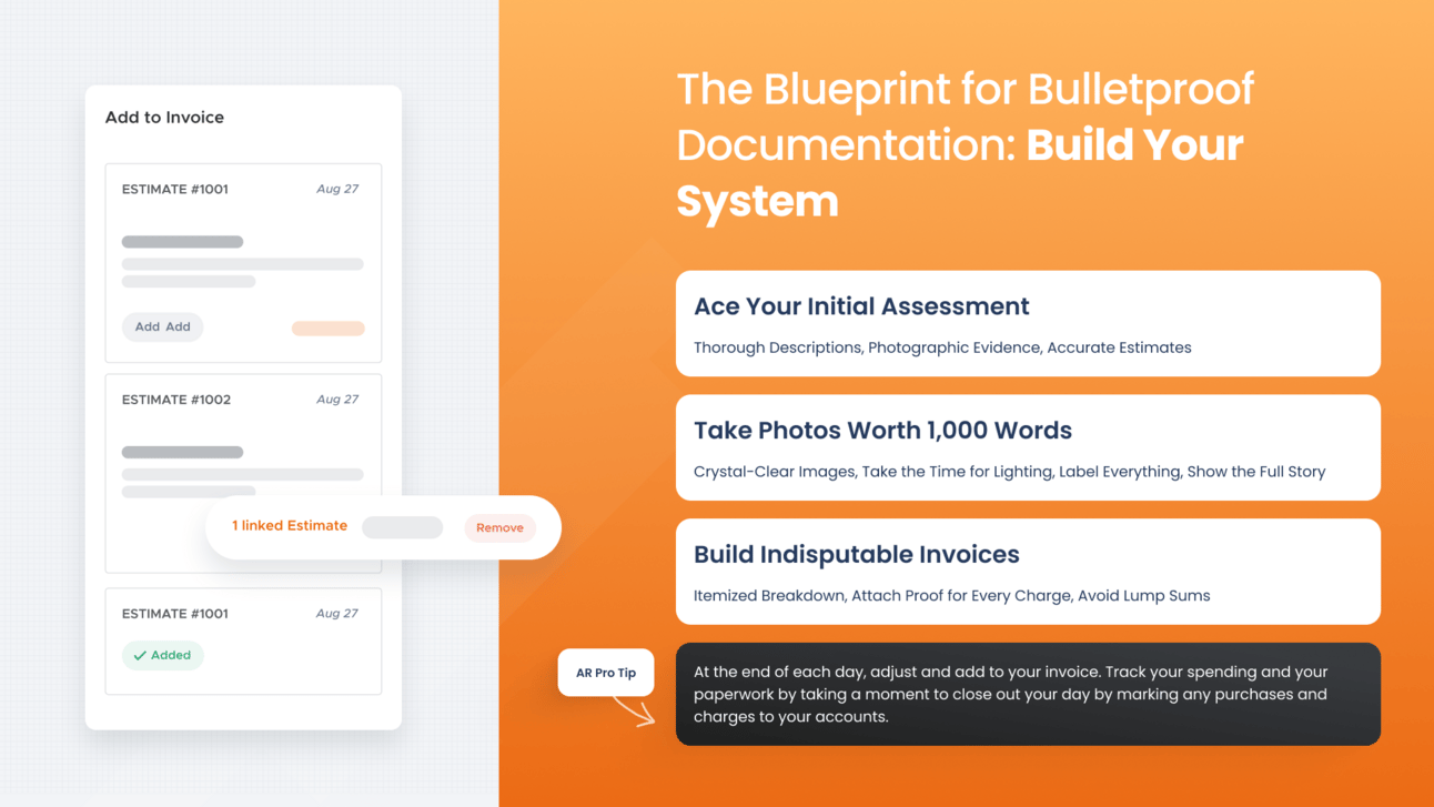 When you provide adjusters with a complete, airtight documentation package from jump, you’re eliminating the back-and-forth, the questions, and the time wasted. You’ll be shocked at the difference in payment speed.