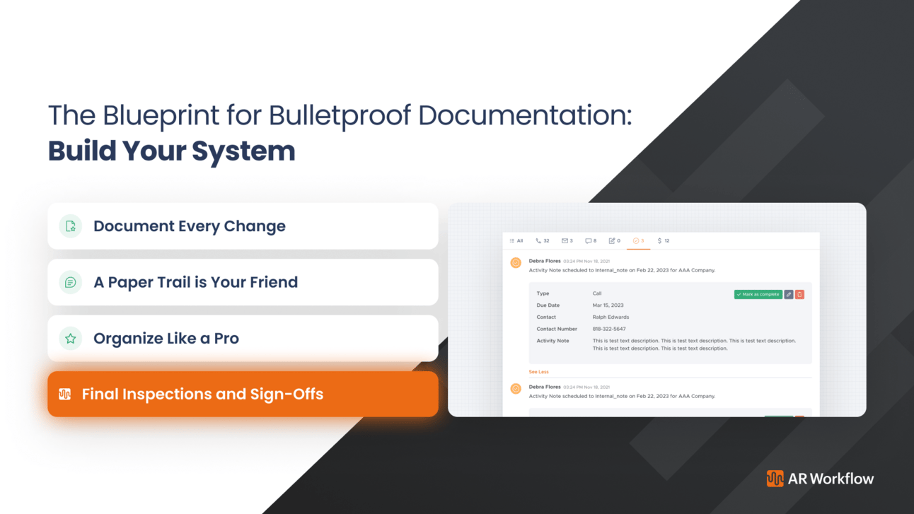 All your documentation needs to be stored in one place—estimates, invoices, communication logs, photos—everything. Use a cloud-based system like AR Workflow to keep your documents organized, secure, and easy to access. Organizing your accounts receivable not only saves you time, it also makes it easier to do every other aspect of your job.